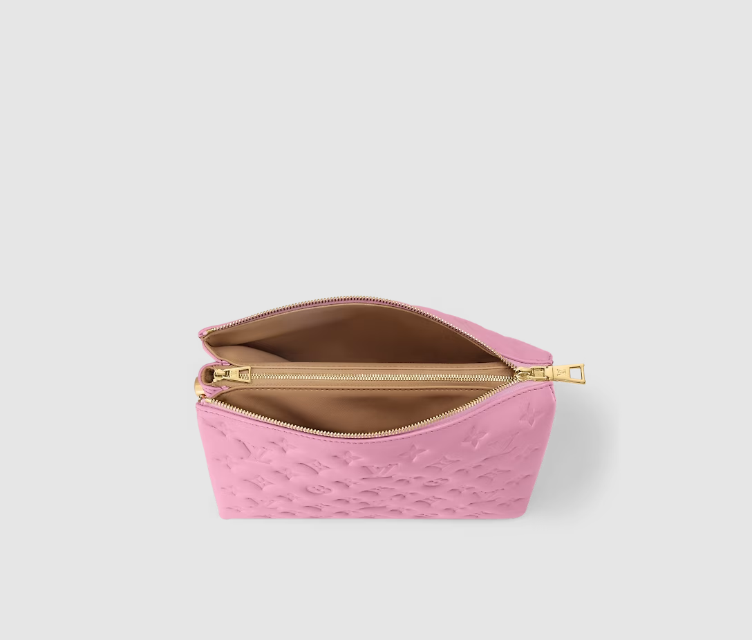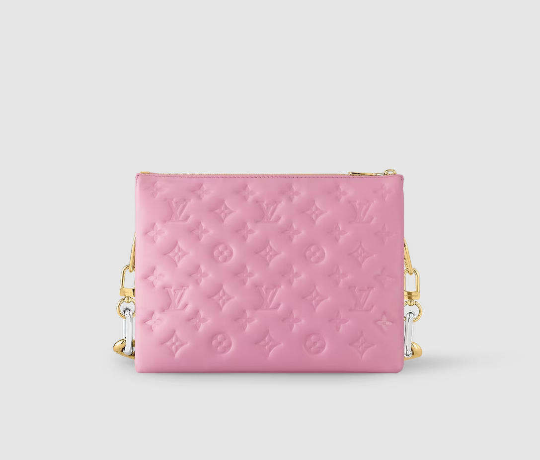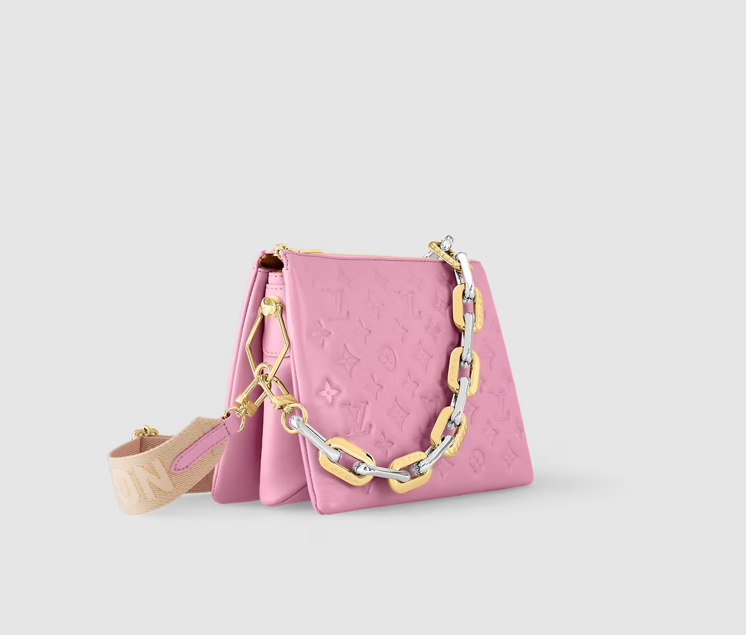 Offered this season in a fashionable candy-pink colorway, the Coussin PM is made from soft, puffy lambskin embossed with Monogram motifs. A new version of the chunky LV chain combines gold with Monogram engraving - and silver-finish links. For a casual-chic allure, the Coussin can be worn cross-body on the wide, removable textile strap.