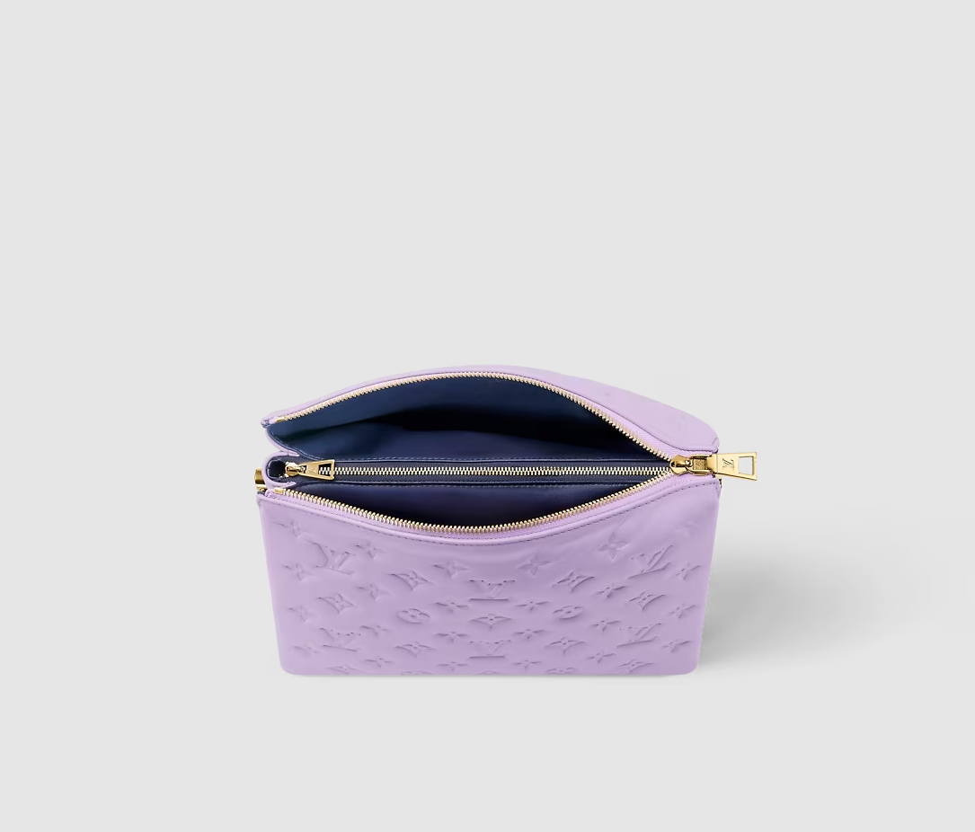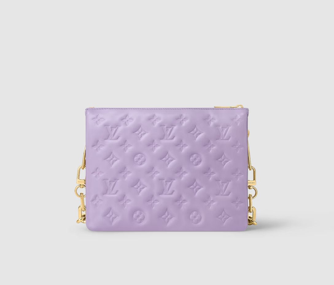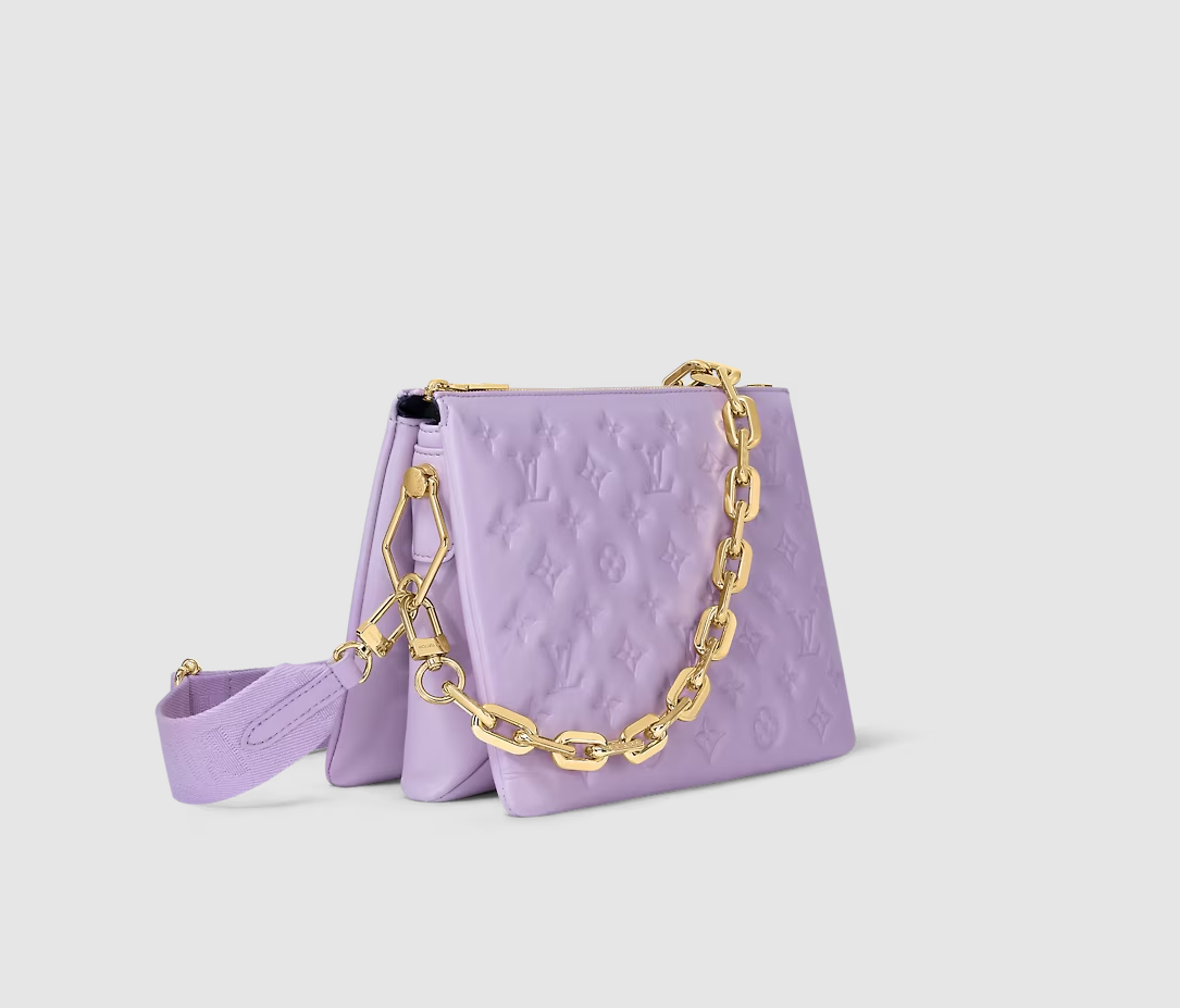 The Coussin PM handbag is made from puffy lambskin with the Monogram motif embossed into the leather. Inside the bag, there are two compartments separated by a zipped pocket. Its chunky gold-color chain and wide textile strap – both detachable – enable multiple carry options.