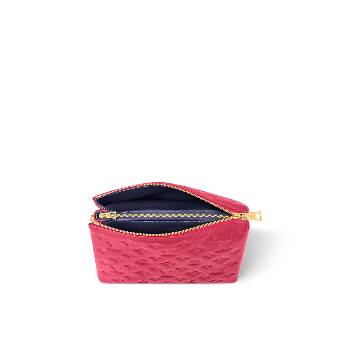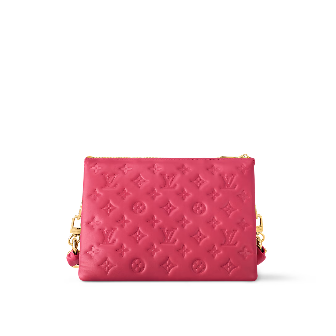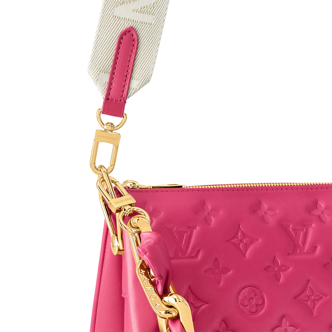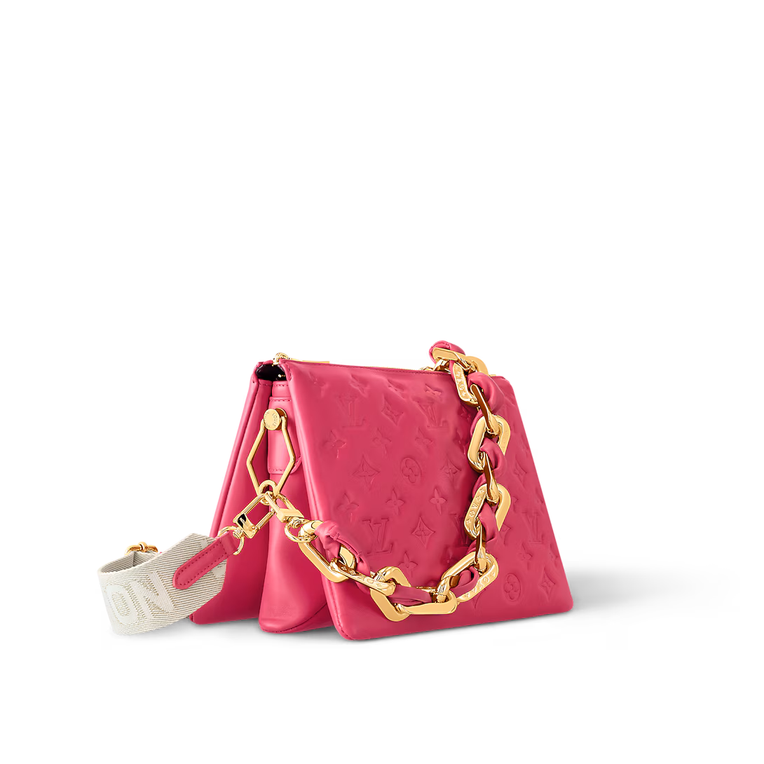 The Coussin PM handbag is made from puffy lambskin with the Monogram motif embossed into the leather. Inside the bag, there are two compartments separated by a zipped pocket. Its chunky gold-color chain and wide textile strap – both detachable – enable multiple carry options.