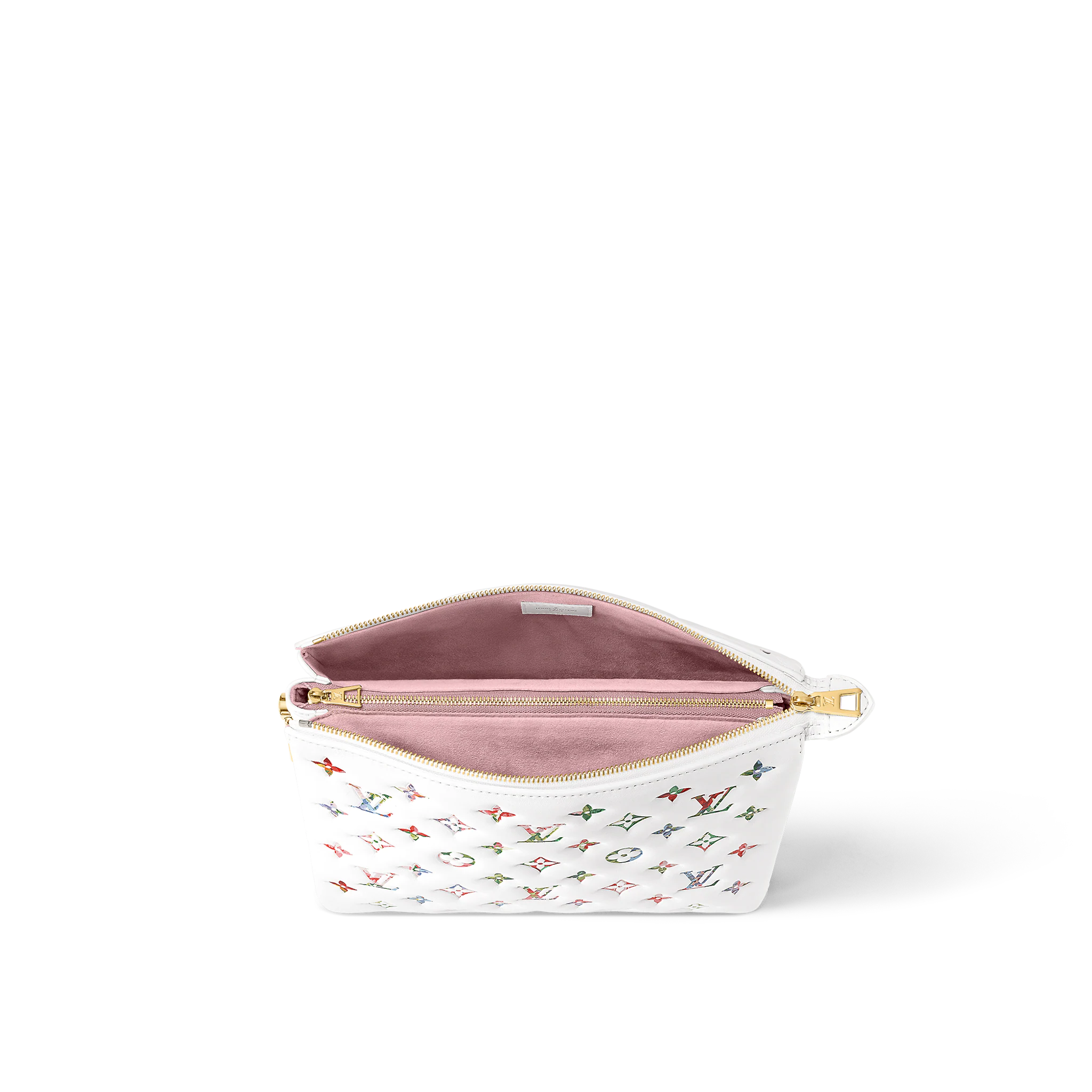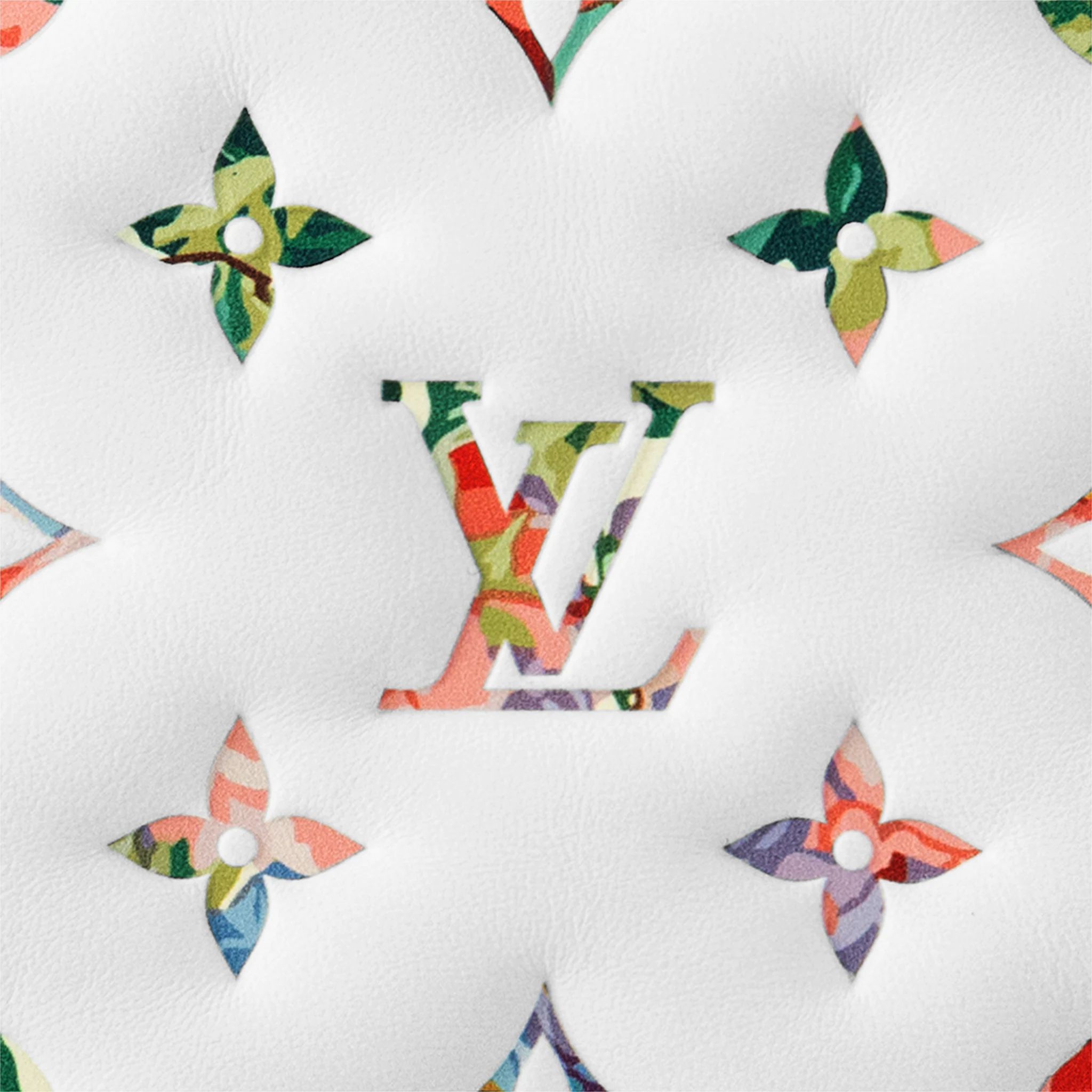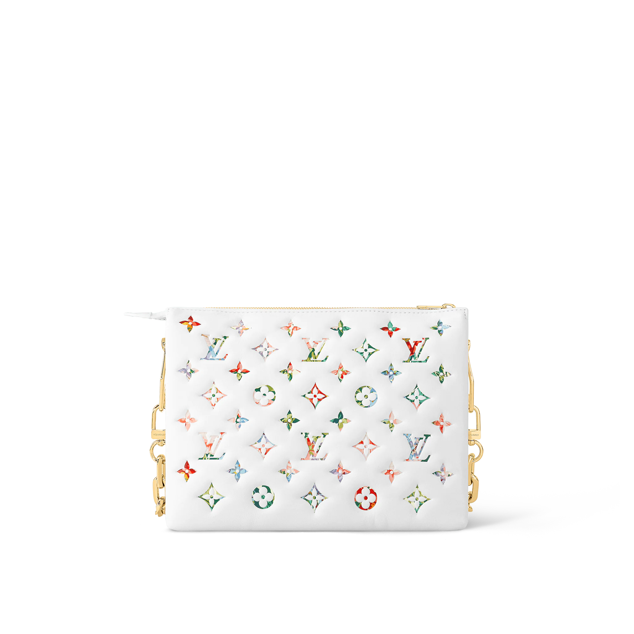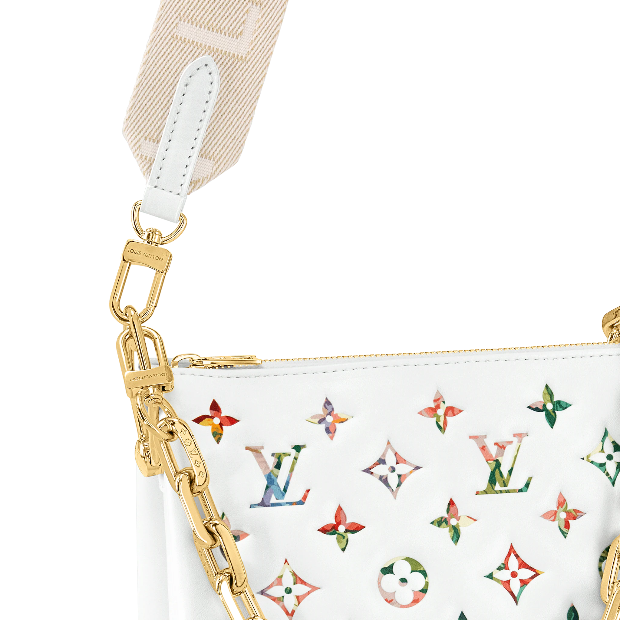 Fashioned from puffy lambskin leather, this Coussin PM handbag is embellished with an embossed Monogram motif with a discreet floral pattern inside the Monogram Flowers. A chunky chain enables shoulder carry while a wide textile strap, removable and adjustable, can be used for shoulder and cross-body carry.