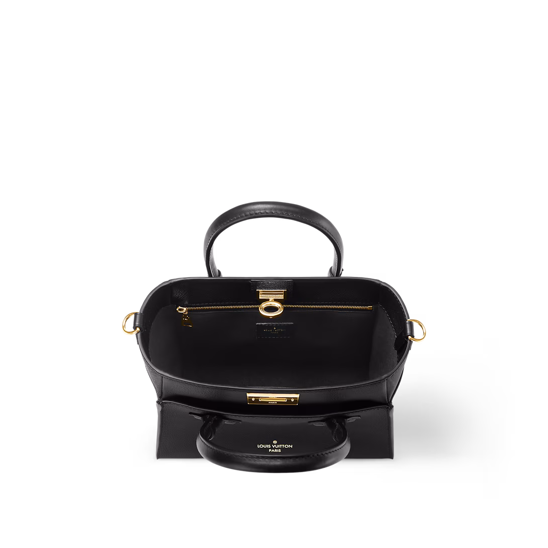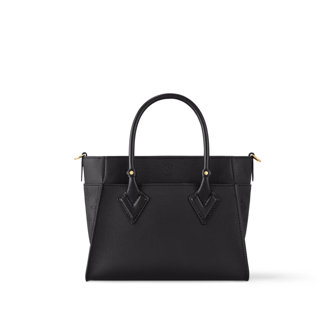 The On My Side tote bag is made from calf leather, with perforated calf leather on the gusseted sides. The elegant colorway is livened up with a gold-color twist closure and gold-color buckles on the removable strap. Two outside pockets and a roomy interior makes this a practical bag.