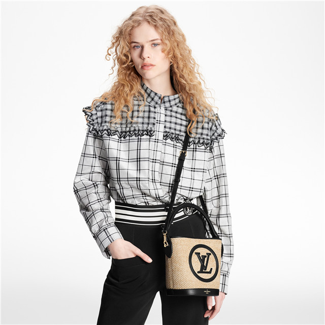 As fresh as a Spring breeze, the Petit Bucket bag is crafted from knitted raffia enriched with elegant leather detailing. The bag features the iconic LV logo patch, while the leather bottom is stamped with the Maison’s golden signature. Easy to wear, with room for one’s daily essentials, this feminine piece goes easily from city to beach.