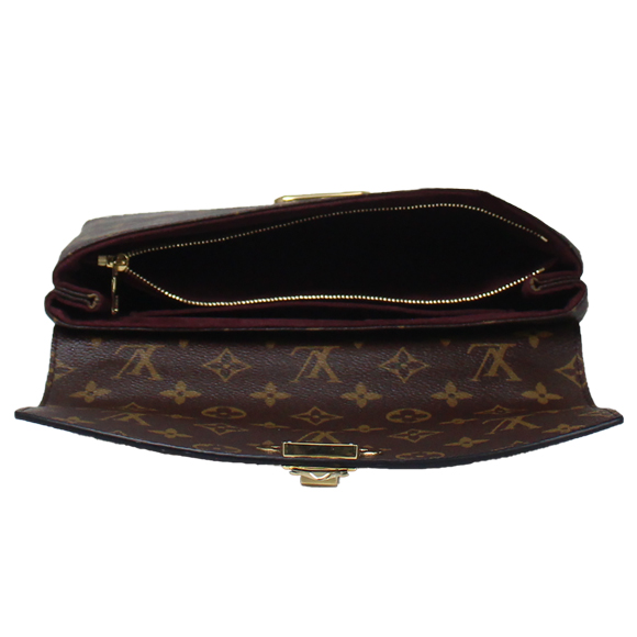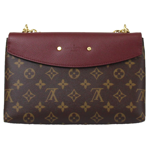 10.2 x 6.4 x 2.8 inchesMonogram coated canvas and cowhide leather cowhide leather trimMicrofiber liningShiny gold color metallic pieces sliding multi carry (shoulder/cross-shoulder) gold colored metal chainFlat leather shoulder piece gold colored metal lock with magnet closureInside smartphone pocket inside zipped pocket
