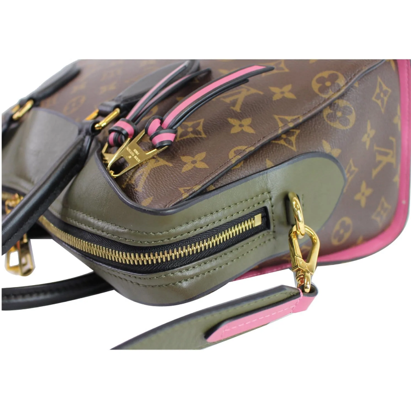 Size: W 13.6" H 9.8" D 5"(Length x height x width ) Coated Monogram canvas with cowhide leather Colourful cowhide leather trimMicrofiber liningGoldtone metallic pieces2 Toron leather handles removable tricolor strap Zipped closure outside zipped pocket with leather
