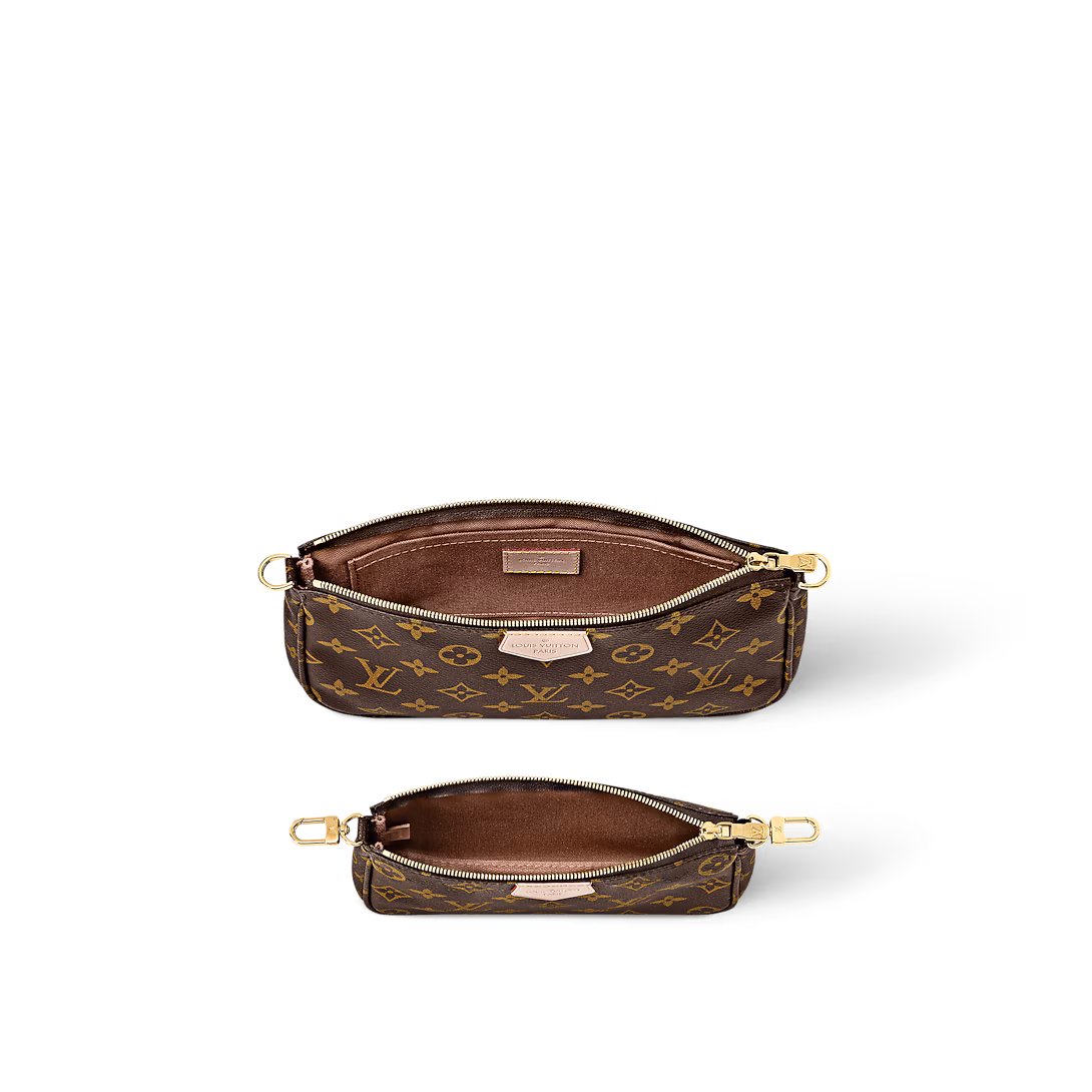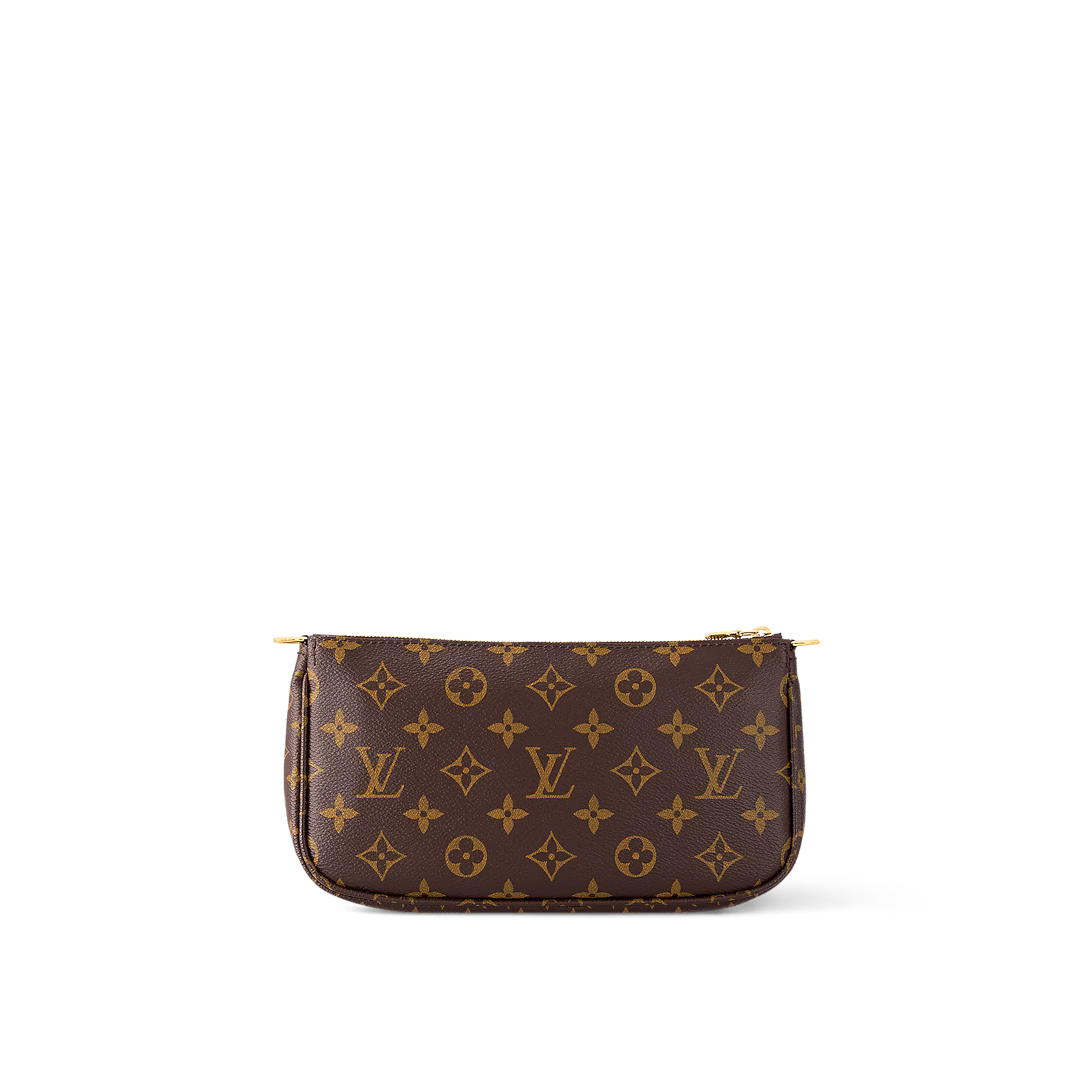 The Multi Pochette Accessoires is a hybrid cross-body bag with multiple pockets and compartments that brings together a Pochette Accessoires. a Mini Pochette Accessoires and a Round Coin Purse. Fashioned from Monogram canvas with a mini Monogram pattern on the sides of the two pochettes. it has both a removable gold-tone chain and an adjustable Louis Vuitton inscribed Jacquard strap for multiple carrying options.