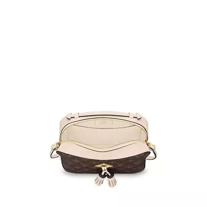 Monogram canvas and smooth calfskin combine in the Saintonge. a compact bag with a youthful vibe. The leather lends contrast and volume to the design. and the tassels are a playful touch. With its top handle and long strap. the bag can be styled in different ways.