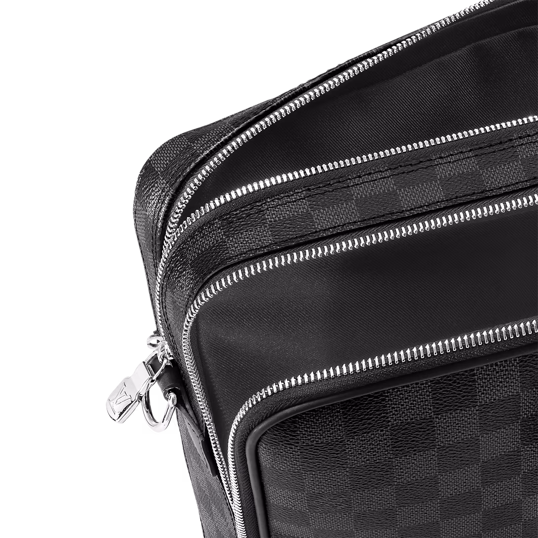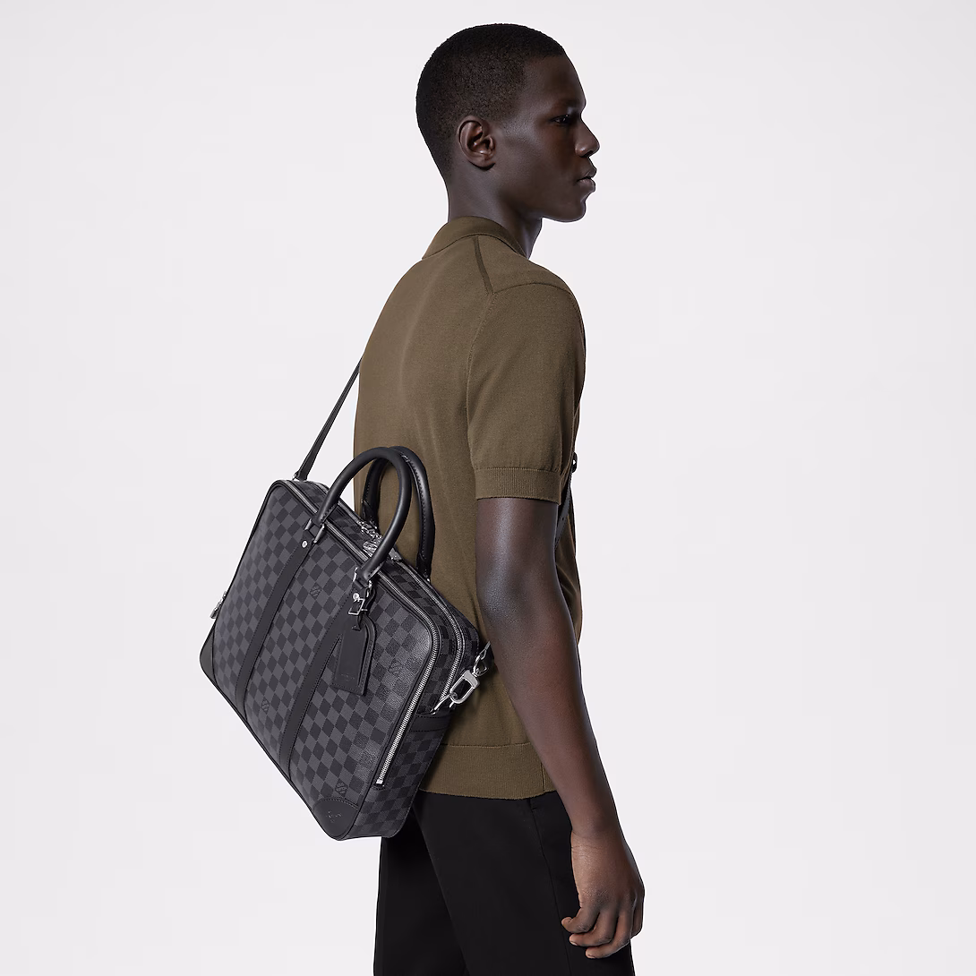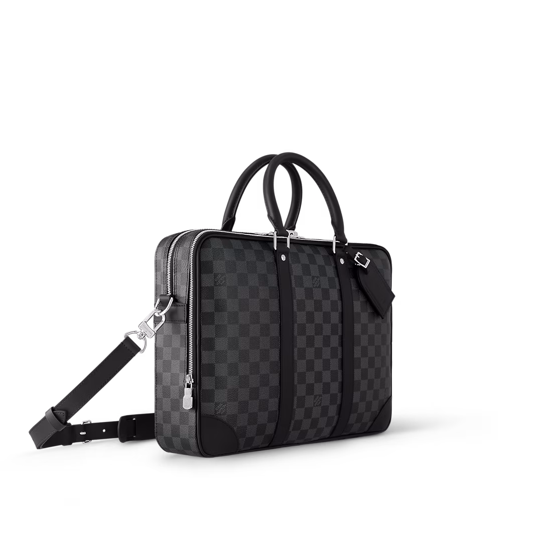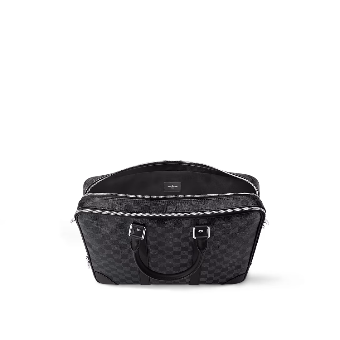 A roomier alternative to the classic attaché case, the Porte Documents Voyage GM is made from Damier Graphite canvas with cowhide-leather trim, including on the two lateral reinforcement bands and two top handles. Inside, there’s a padded compartment that can fit a laptop, as well as a duo flat pocket and zipped pocket.