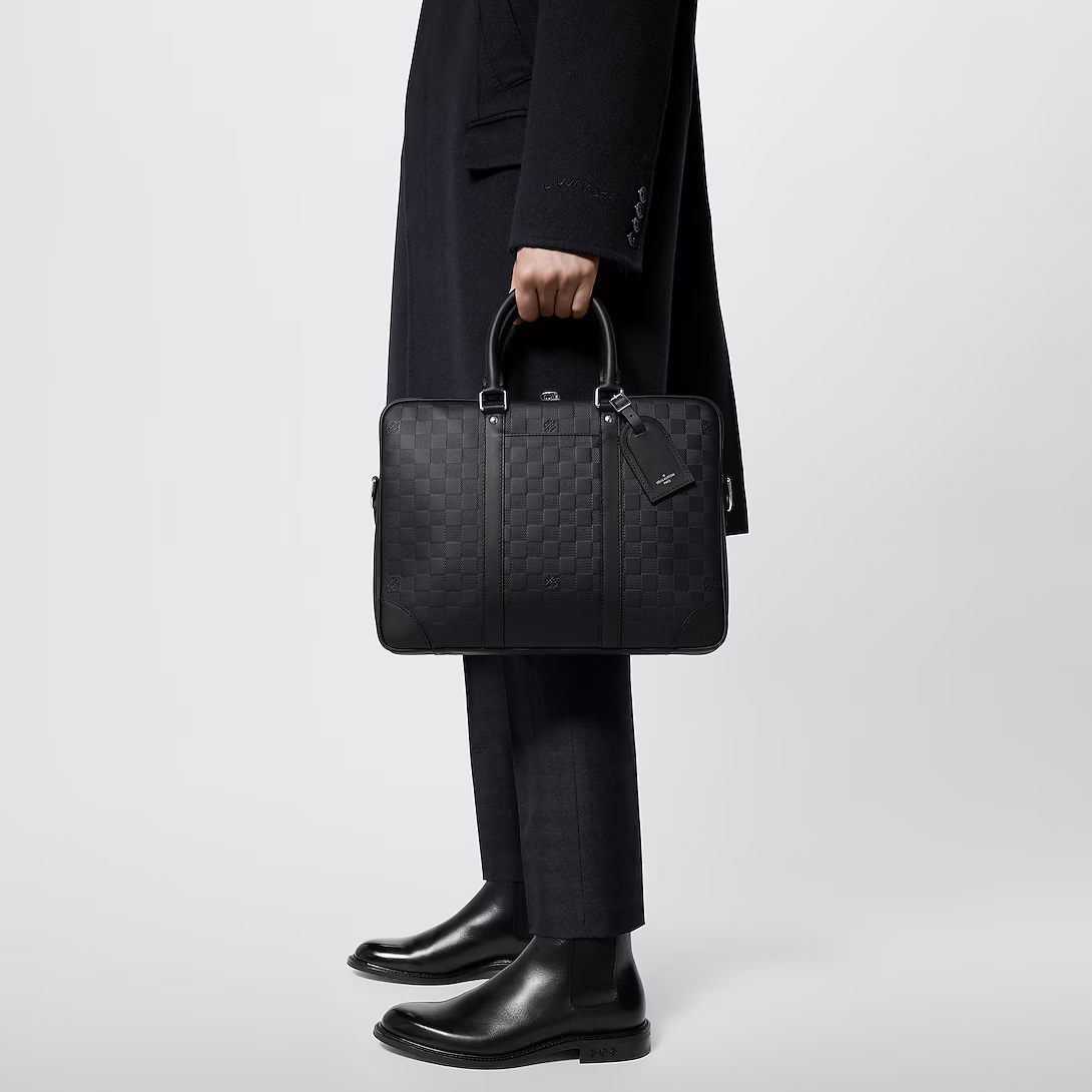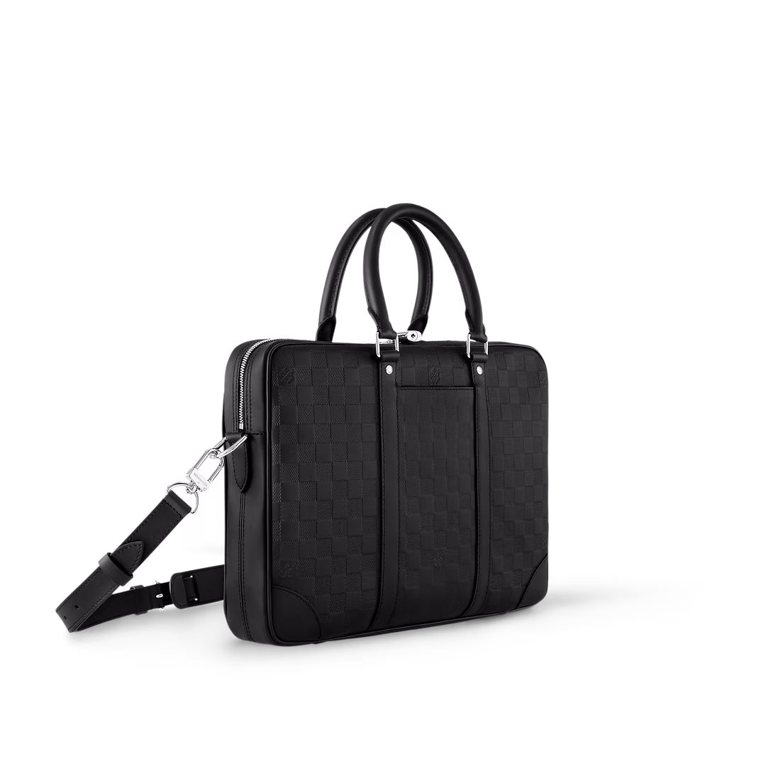 Damier Infini cowhide leather, with its emblematic checkerboard pattern embossed into the leather, brings subtle elegance to this Porte-Documents Voyage PM briefcase. The rolled-leather top handles and removable name tag, also in leather, give it a statutory feel while the adjustable – and detachable – shoulder strap makes it practical.
