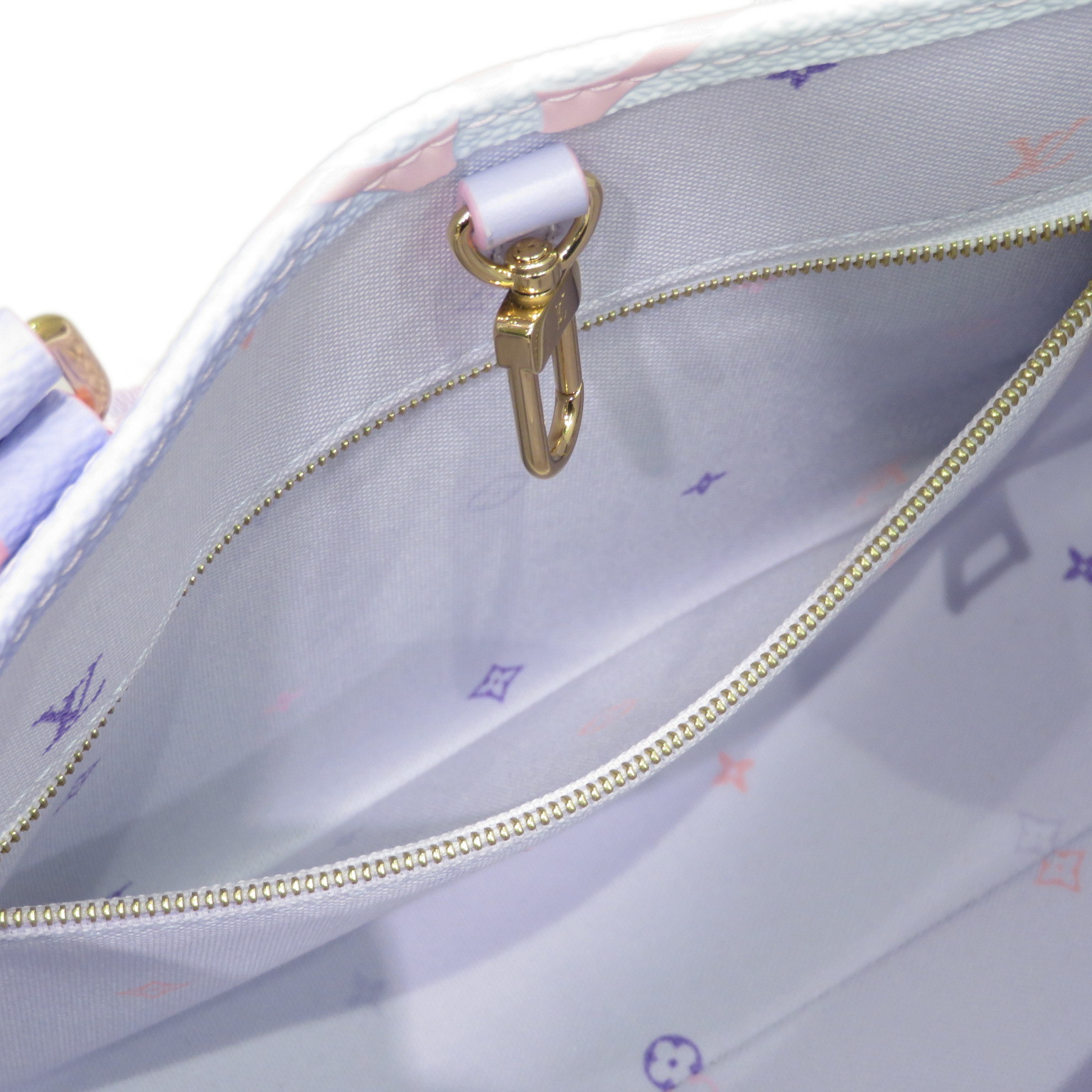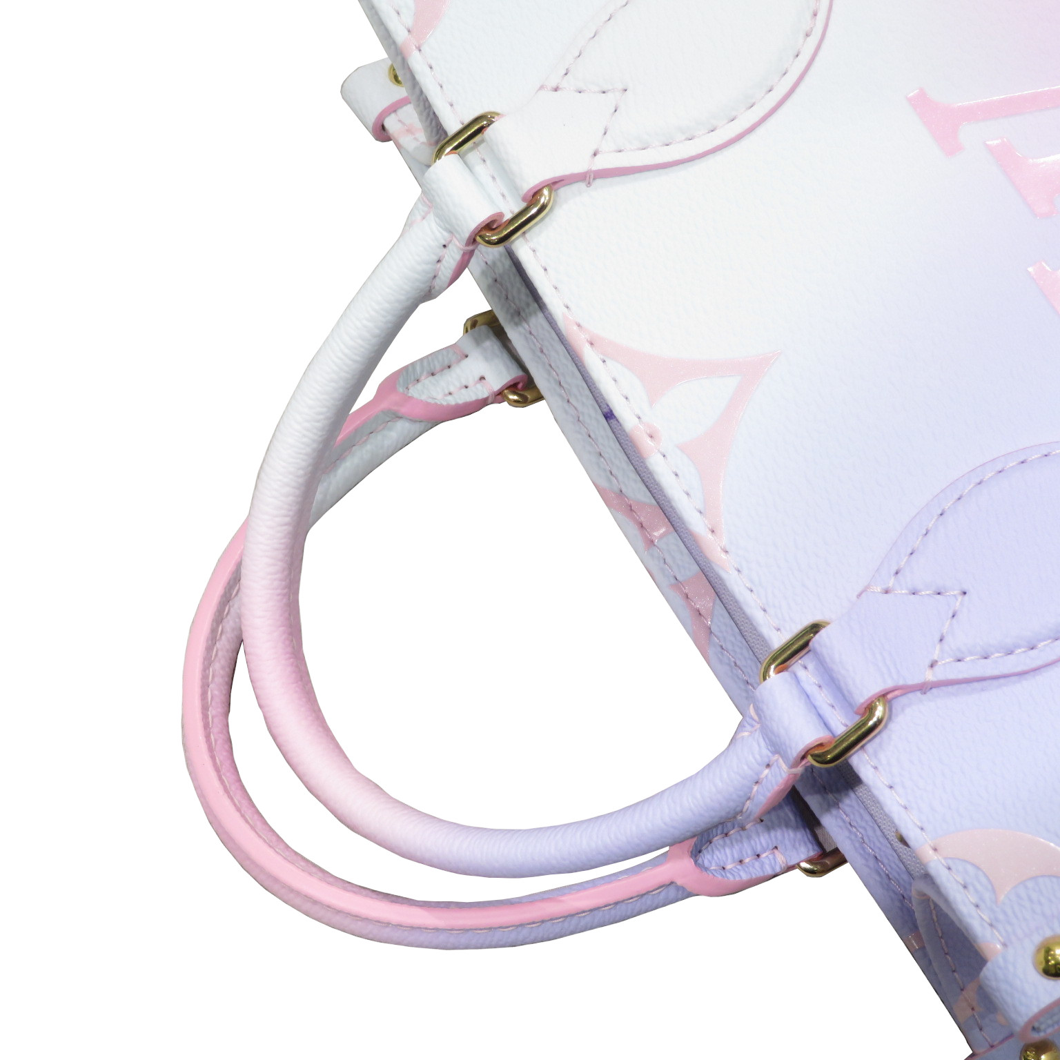 Characteristics: Fashioned from Monogram canvas in a new gradient pastel colorway, the OnTheGo PM tote brings a fresh touch to Spring silhouettes. This versatile bag offers many styling options, thanks to its cute detachable coin purse, removable jacquard strap, and two articulated Toron top handles. The most compact OnTheGo model, it easily holds a tablet, wallet and smartphone.