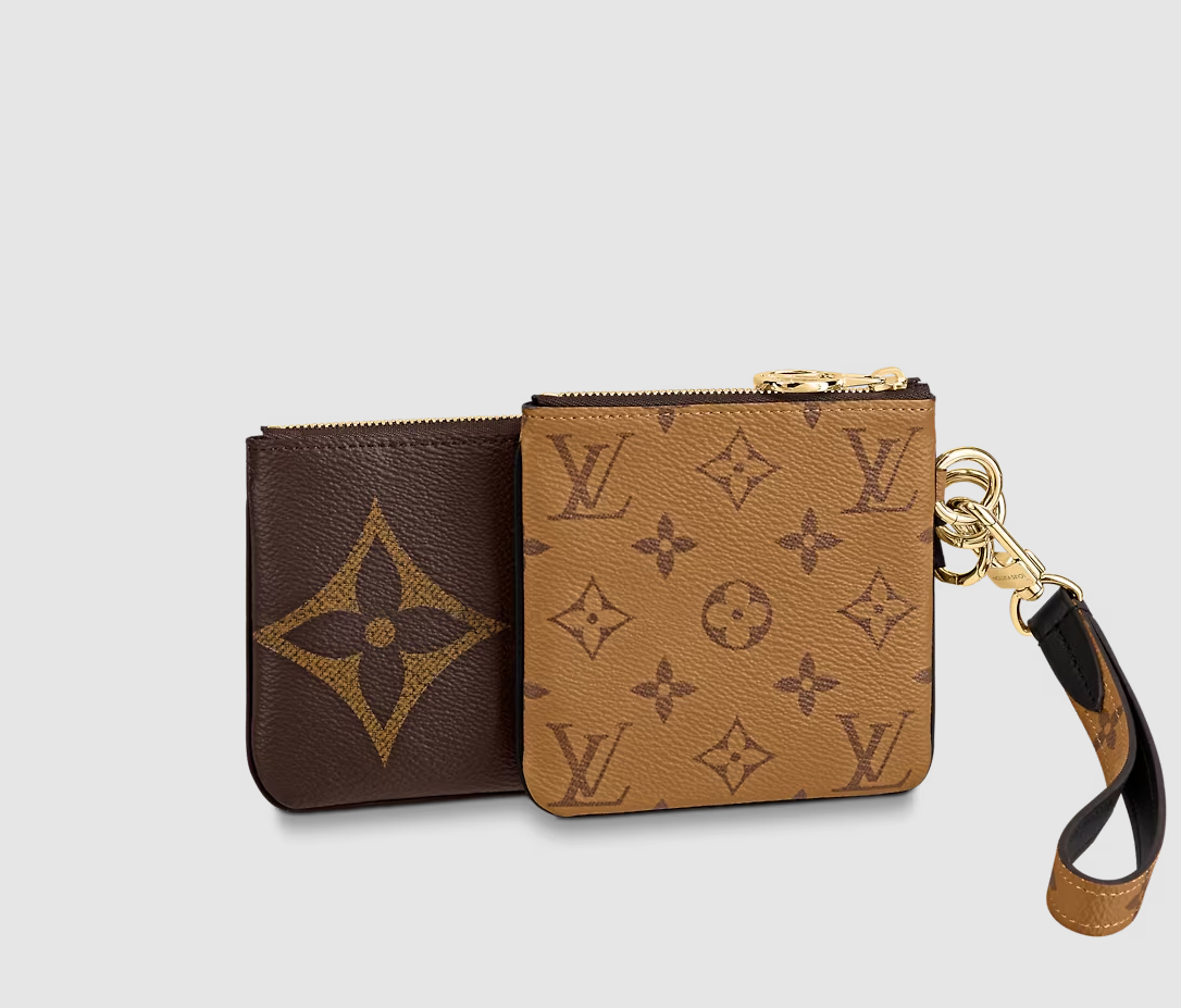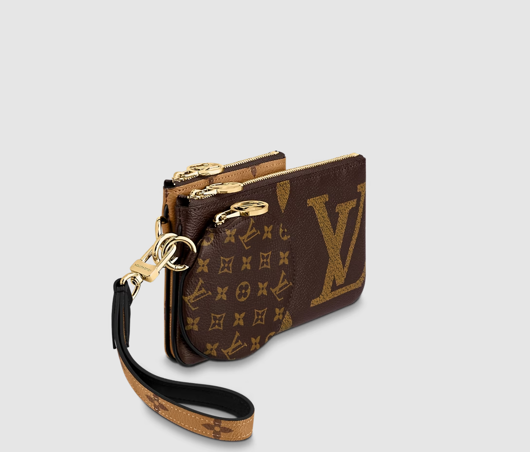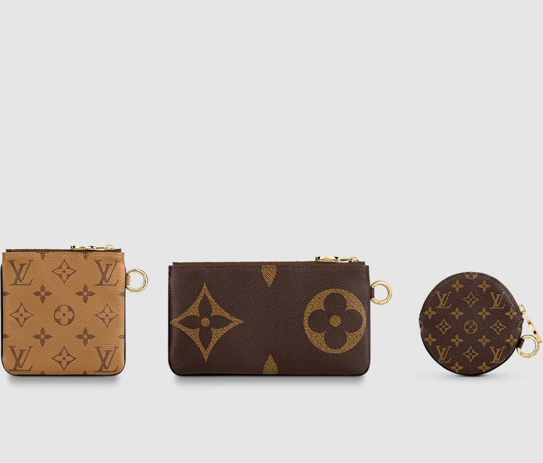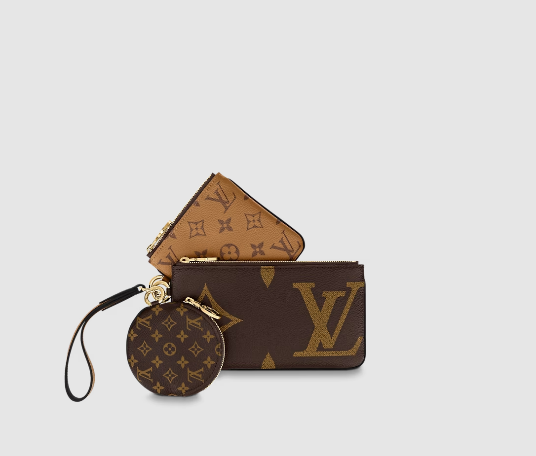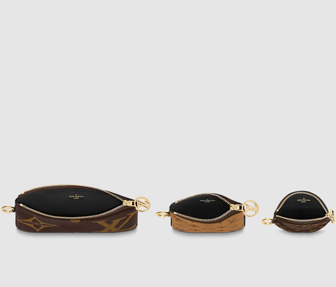 The Trio Pouch is an ingenious design combining three different pouches in three variations of Louis Vuitton's iconic Monogram canvas. Ideal for essentials, the pouches can be used together or separately, and carried in the hand by the wristlet or attached to a bag or belt. They are secured with gold-tone LV Circle zips.